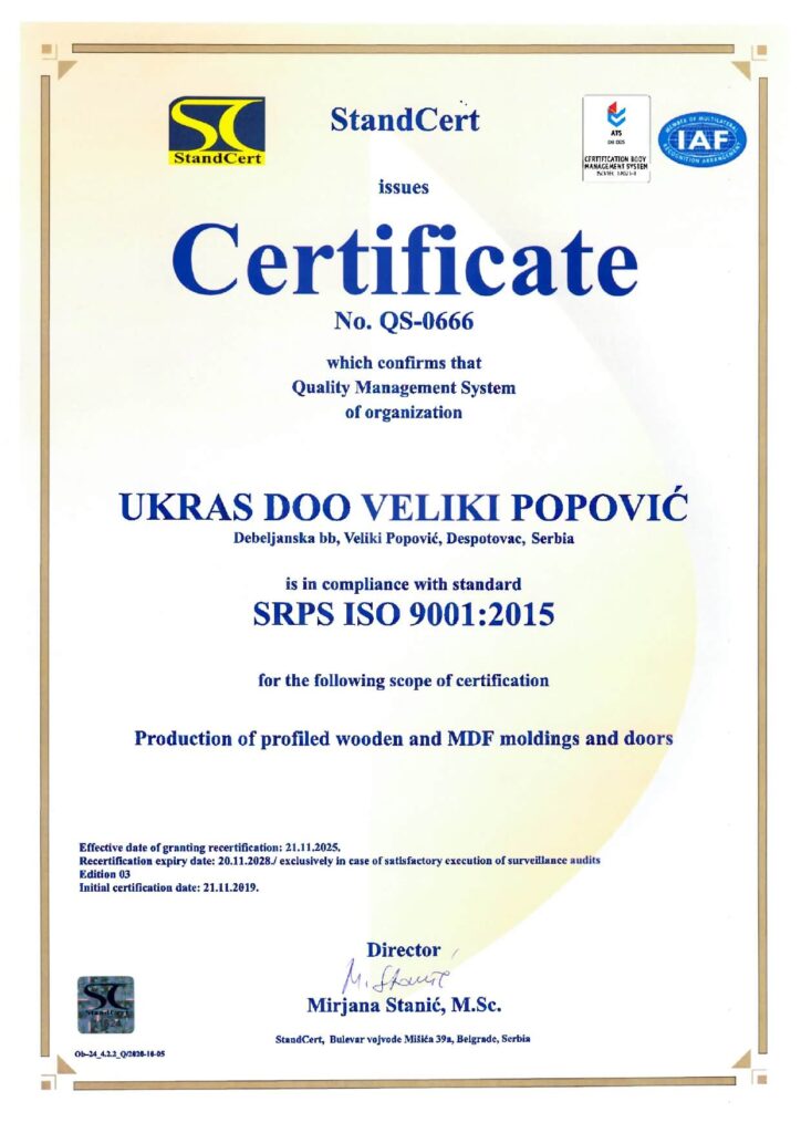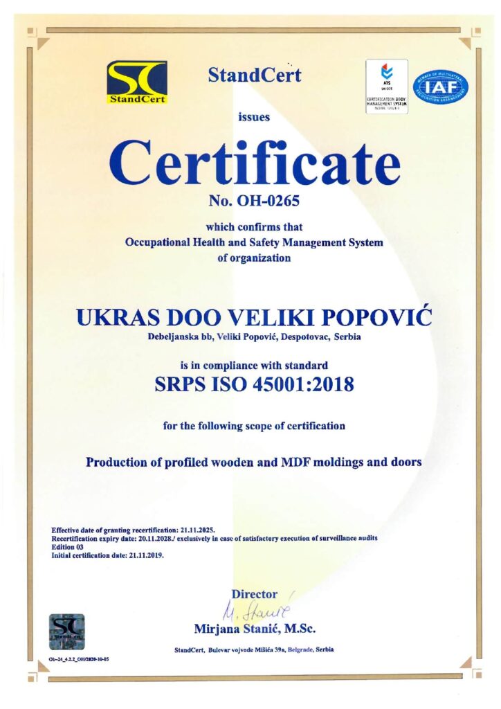 - Implementation and continuous improvement of the integrated management system in accordance with the requirements of SRPS ISO 9001:2015 and SRPS ISO 45001:2018.